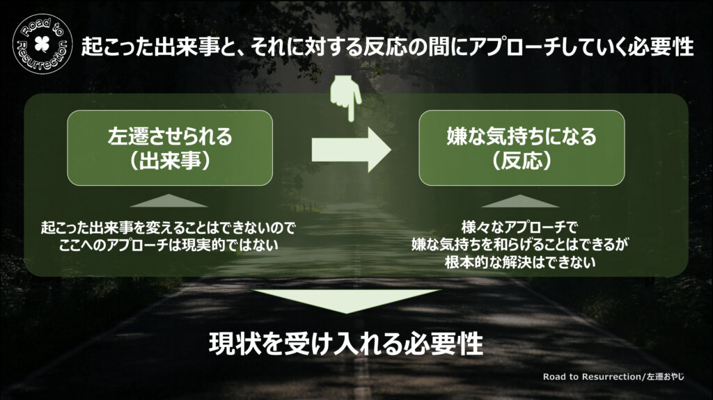 そうなると、起こった出来事と嫌な気持ちになる反応の間にアプローチしていく必要性がある。