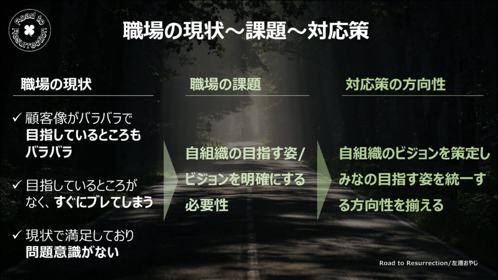 上述のような職場の現状になっているのは、自組織として目指す姿/ビジョンがなく、みんな何処を目指せばよいのかわからないことが要因だと思う。