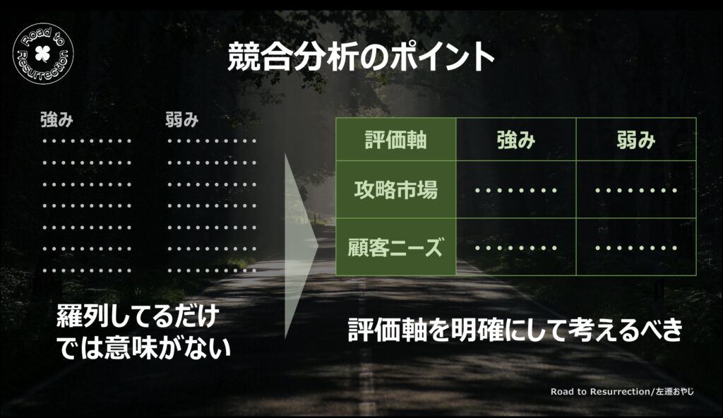 • 攻略すべき市場、および 顧客ニーズに対する競合他社の強み/弱みを考えていくことで、より効果的な分析に