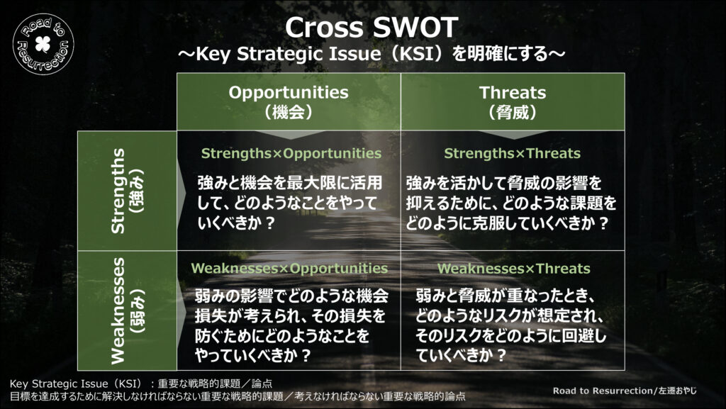 ・Weaknesses(弱み)× Threats(脅威) - Cross SWOTで、Key Strategic Issue(KSI)を導き出す。