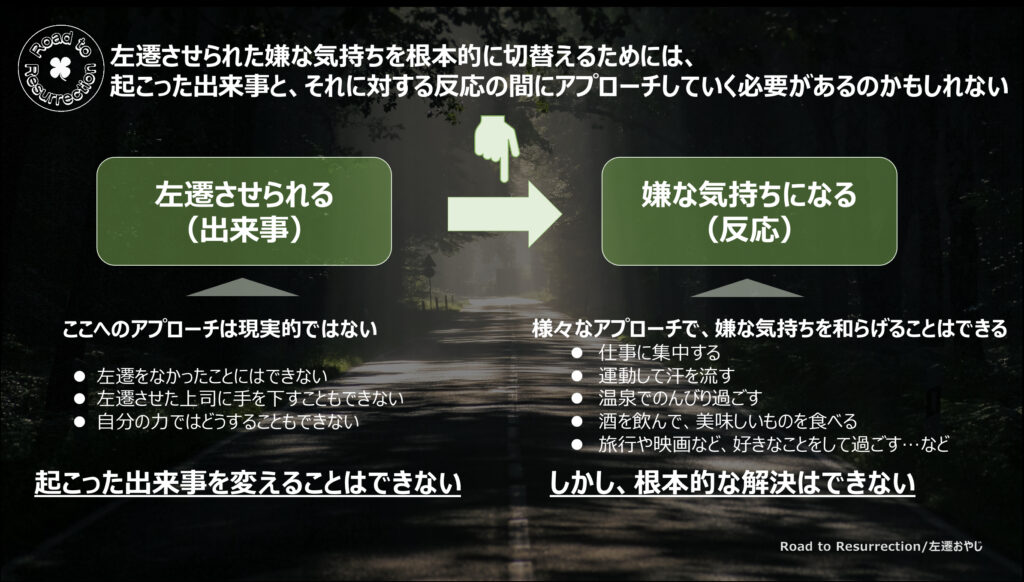 そう考えると、左遷された出来事と、その出来事に対して嫌な気持ちになる反応の間にアプローチする必要があるかもしれない。。。