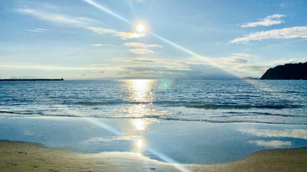 砂浜の向こうに広がる景色と眩しい太陽の光を浴び、心をリフレッシュする。