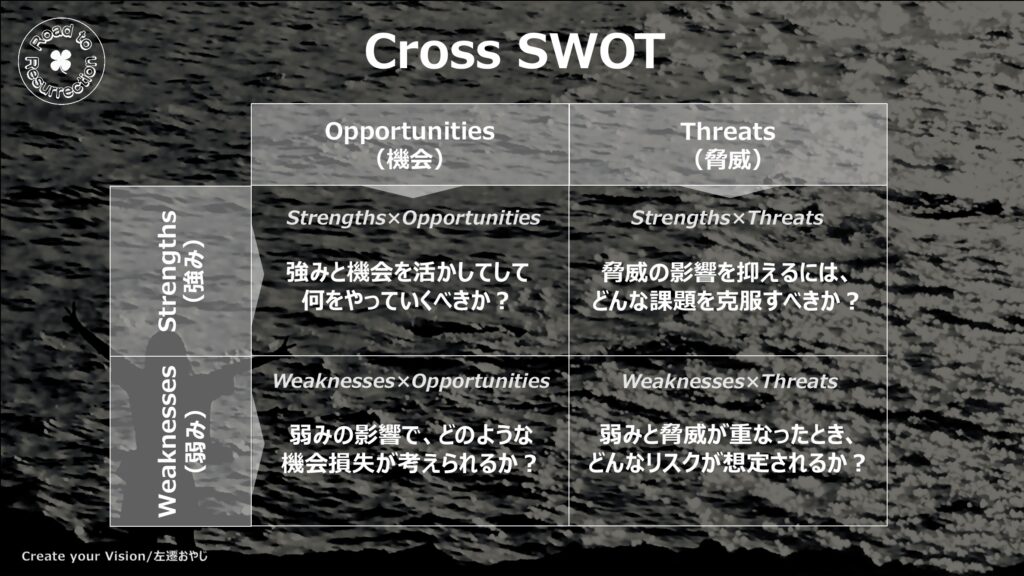 • SWOTで整理した要素を、クロスで掛け合わせて分析していく。