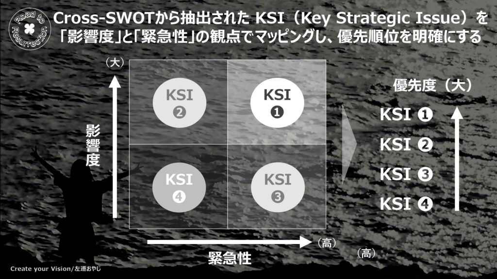 KSI(Key Strategic Issue)として導き出された戦略的に重要な課題/論点は、どれも重要な位置付けではあるが、全て同時にできるわけではないと思うので、優先順位を明確にする。
